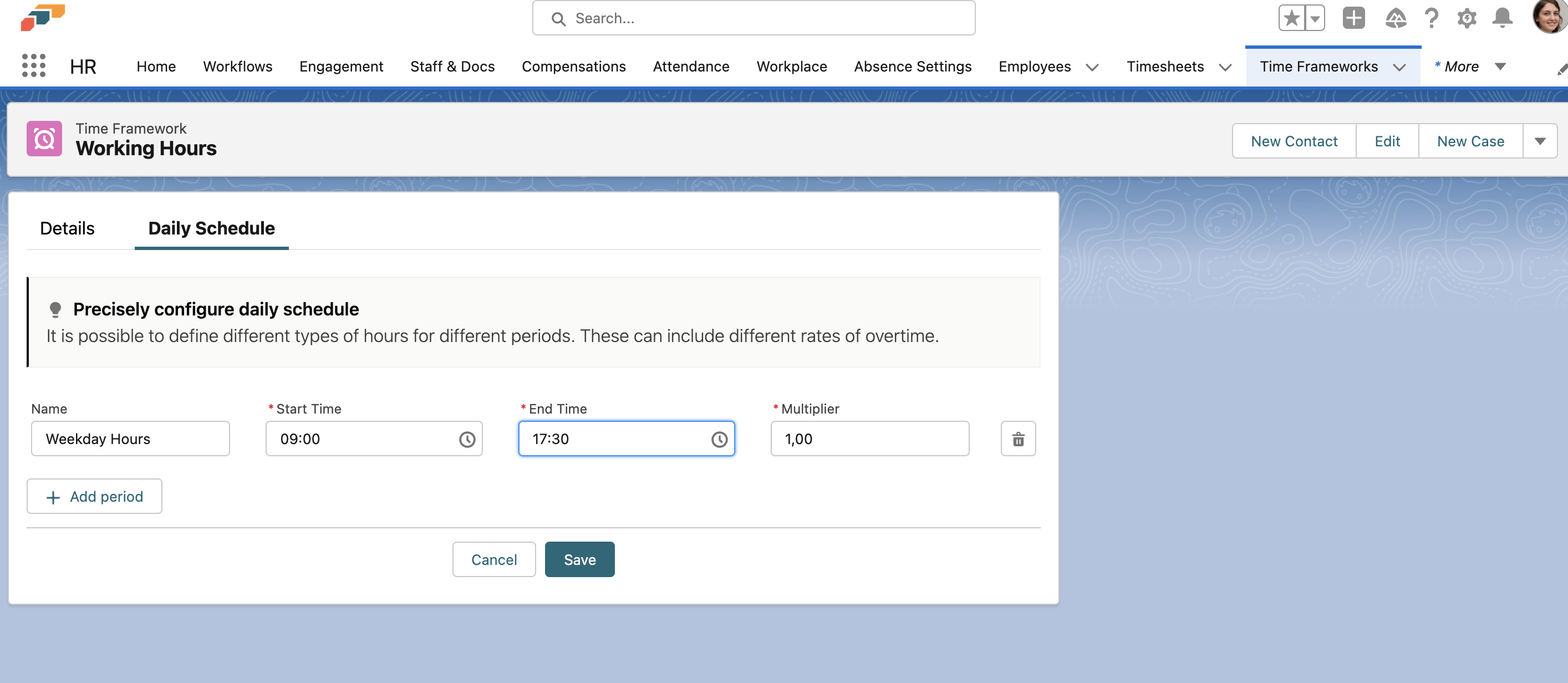 Β Frame Working Hours: Set defined time periods during which employees can log work hours using Time Frameworks on flair HR. E.g. Make normal working hours loggable between 9.00am-5.30pm. Or fix overtime to a certain number of hours. π