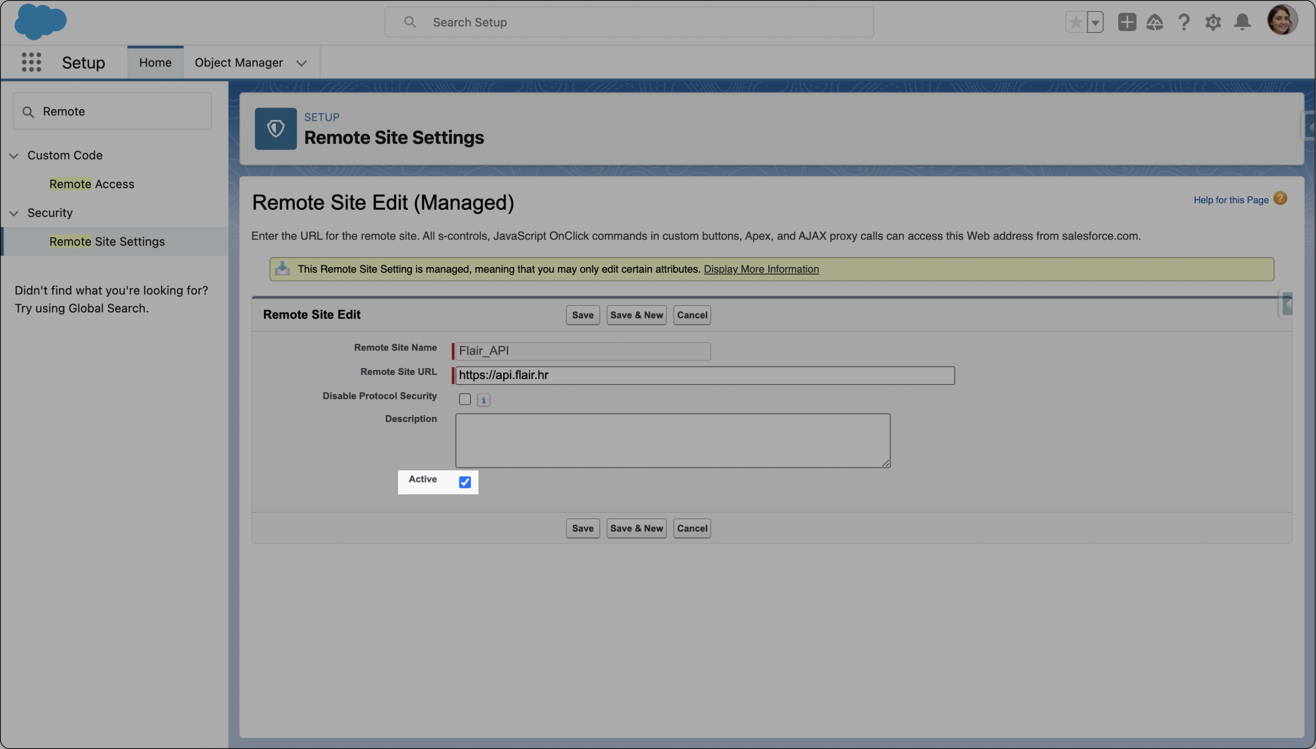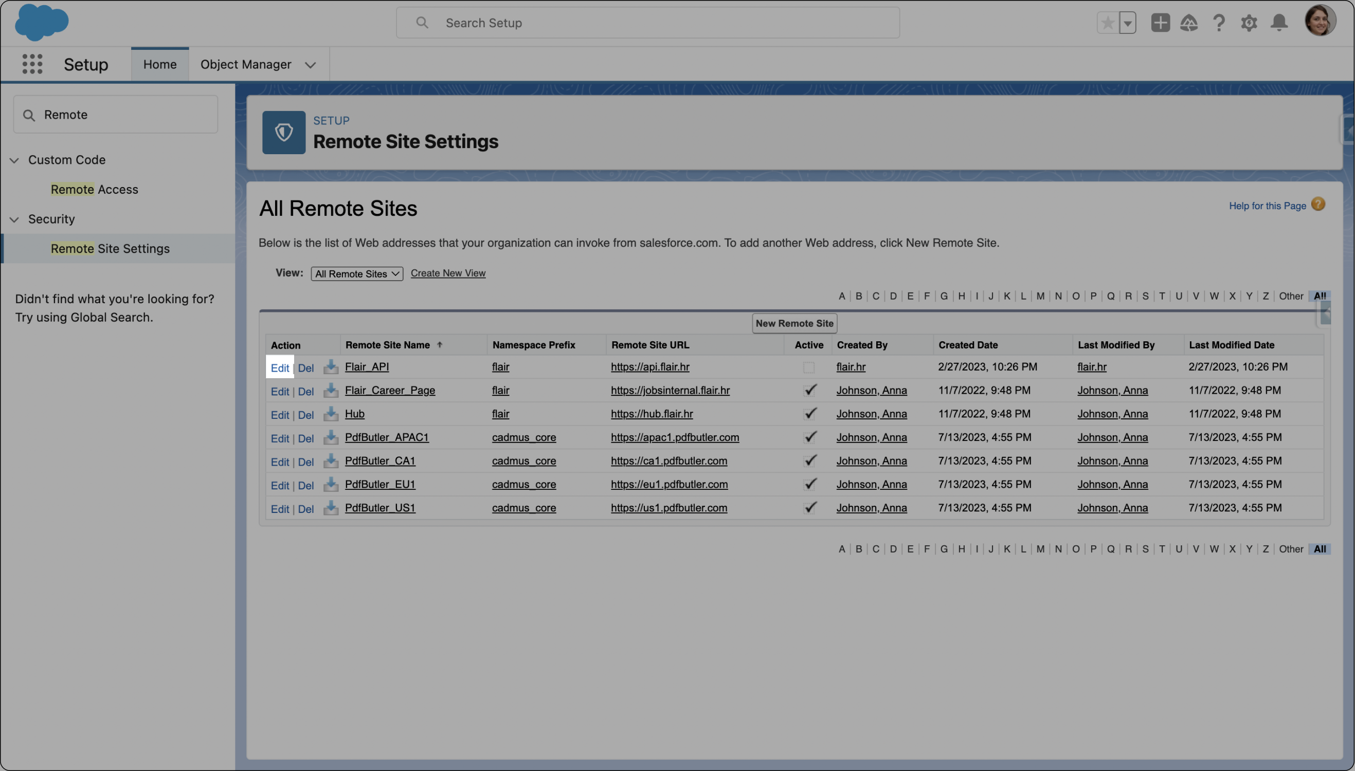 - On the Remote Site Settings page, locate the Remote Site Name related to the Flair API