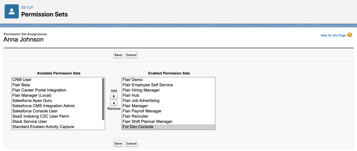 - Add your newly created permission set using the Available Permission Sets section. In this example, we will add the permission set we created, For Dev Console.