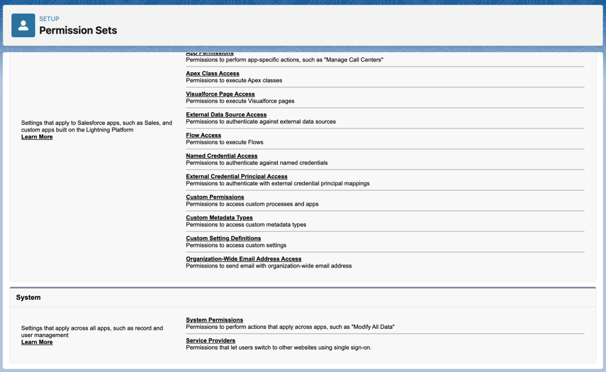 - Within the newly created permission set, click on the System Permission tab underneath the System heading. Here you will be able to edit types of permissions that are applicable across multiple applications.