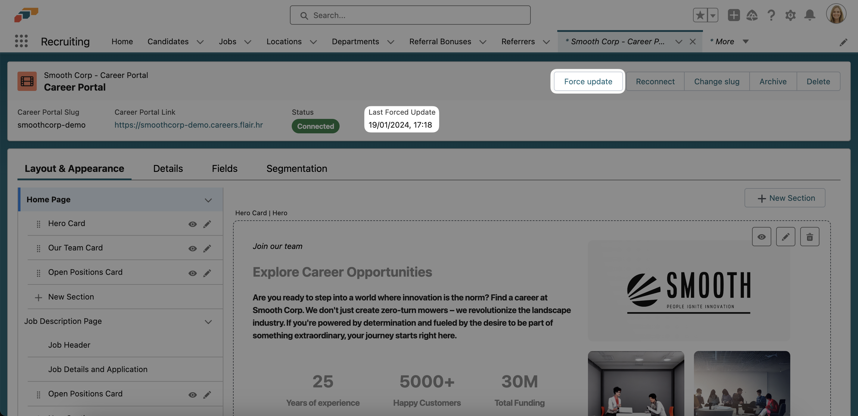 Occasionally, when you make changes to your career portal and publish them, your career portal may not be updated immediately. This can be due to caching. To solve this, we’ve added a button to the Career Portal Setup page in flair Recruiting.