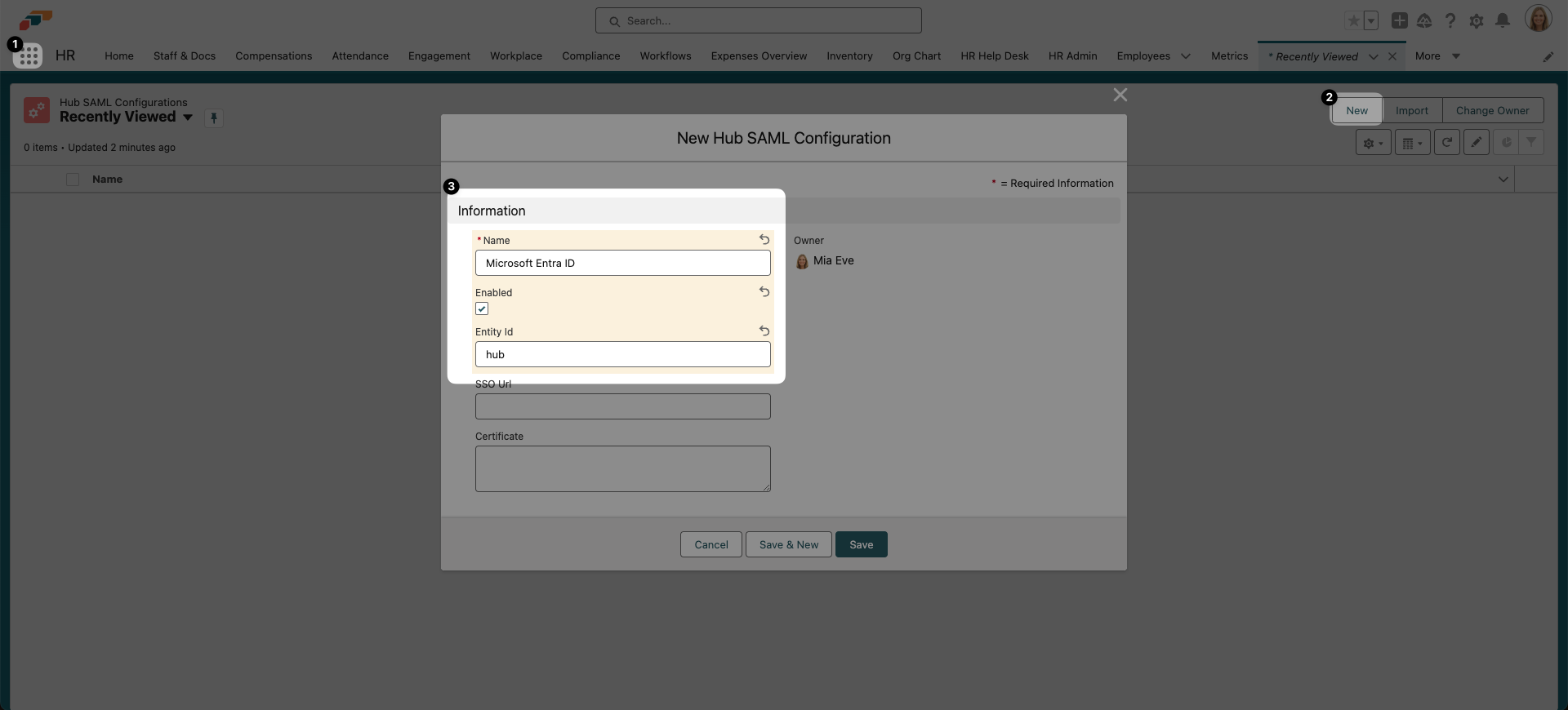- Now go back to the flair app on Salesforce and use the App Launcher 𓃑 to find the Hub SAML Configurations page. Click New and fill in the fields.