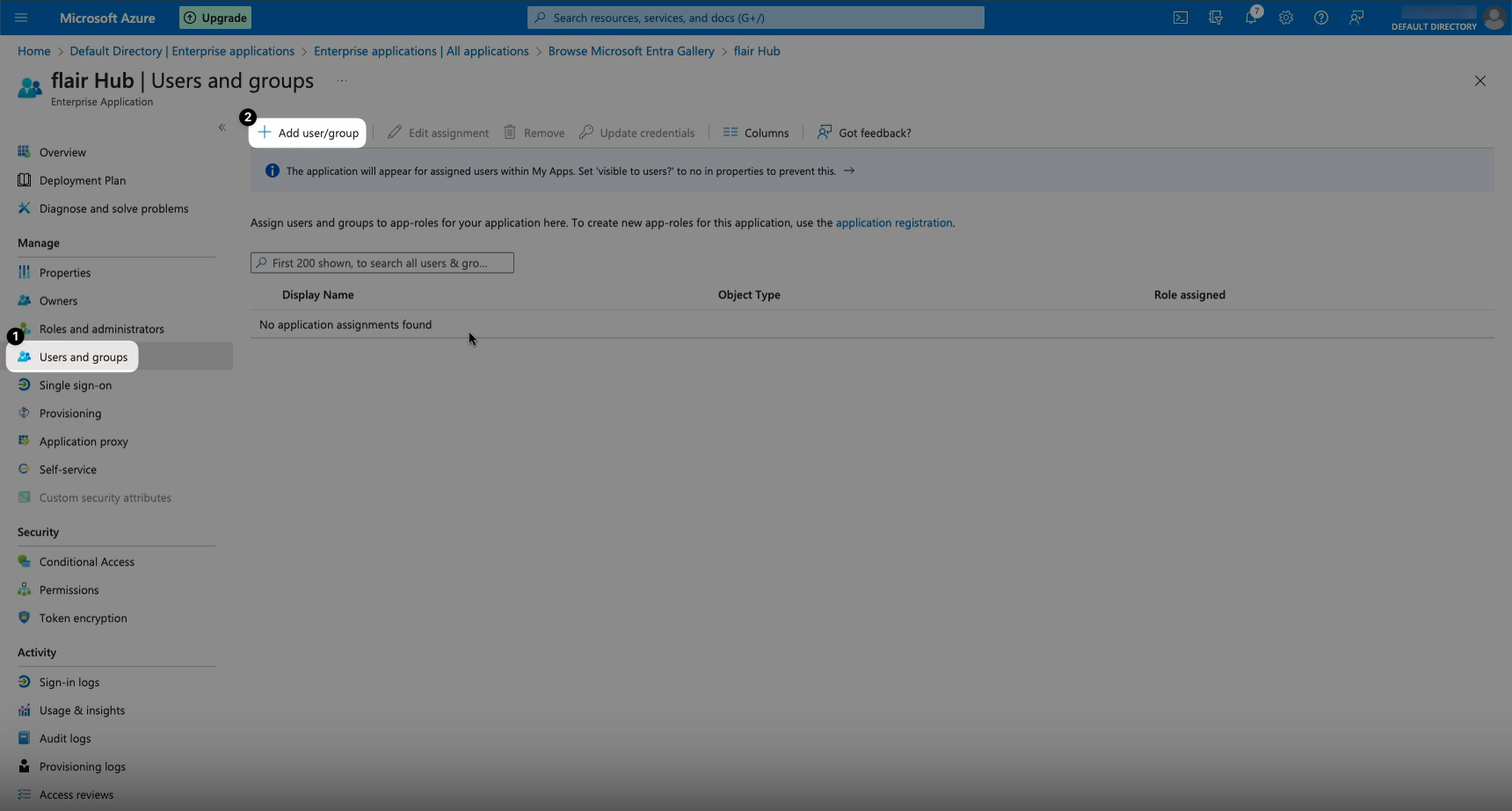 - Click Create Your Own Application from the tabs at the top of the screen. Give your app a name (e.g. flair Hub), select the option “Integrate any other application you didn’t find in the gallery (Non-gallery)”, and then click Create.
