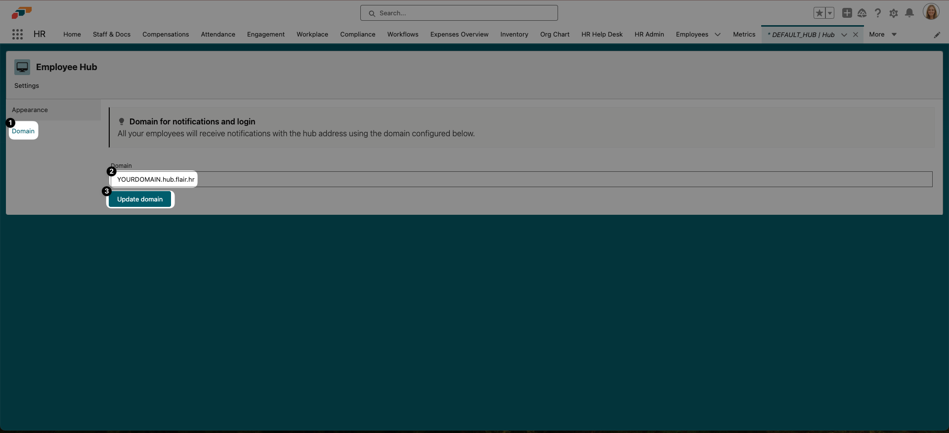 - Click Domain in the menu on the left and enter your Employee Hub domain into the Domain field. It should look like this: YOURDOMAIN.hub.flair.hr (YOURDOMAIN should be replaced with your domain name, which you can find in your Hub’s URL). Then click Update Domain.