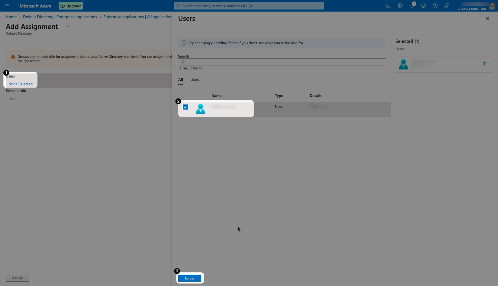 - On the next page, select Users to open a new window showing your users. Check the box next to all the users you want to enable SAML login for and then click Select.