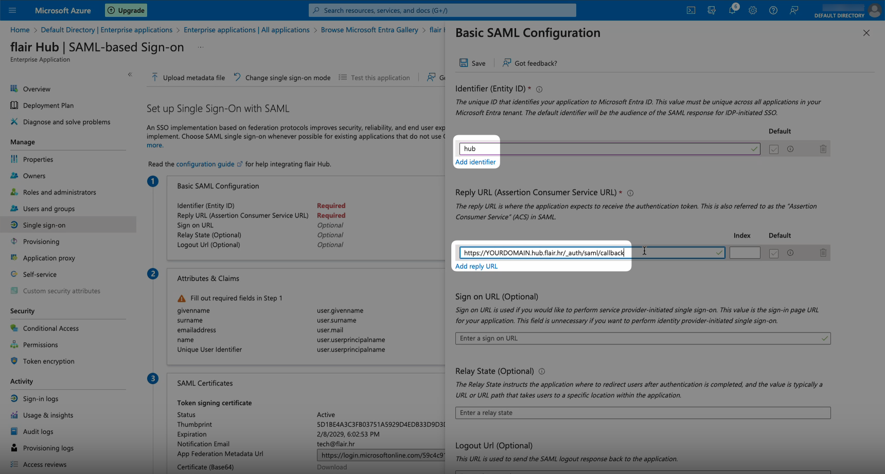 d) SSO URL: To find the SSO URL, go to back to the SAML app you created in Microsoft Azure. Scroll down to box 4 (named “Set up flair Hub”) and copy the URL in the Login URL field. Paste this URL into the SSO URL field in flair.