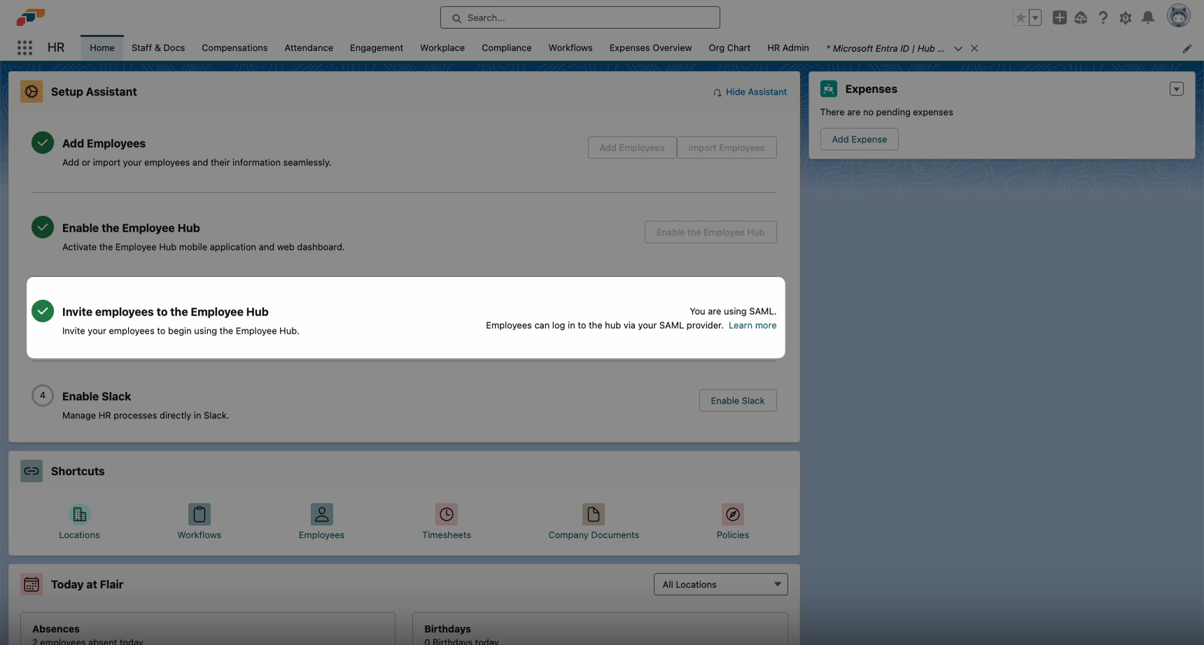 - Now, when you go to the Home page in the flair HR app, you will see a message in the Setup Assistant informing you that you are using SAML login.