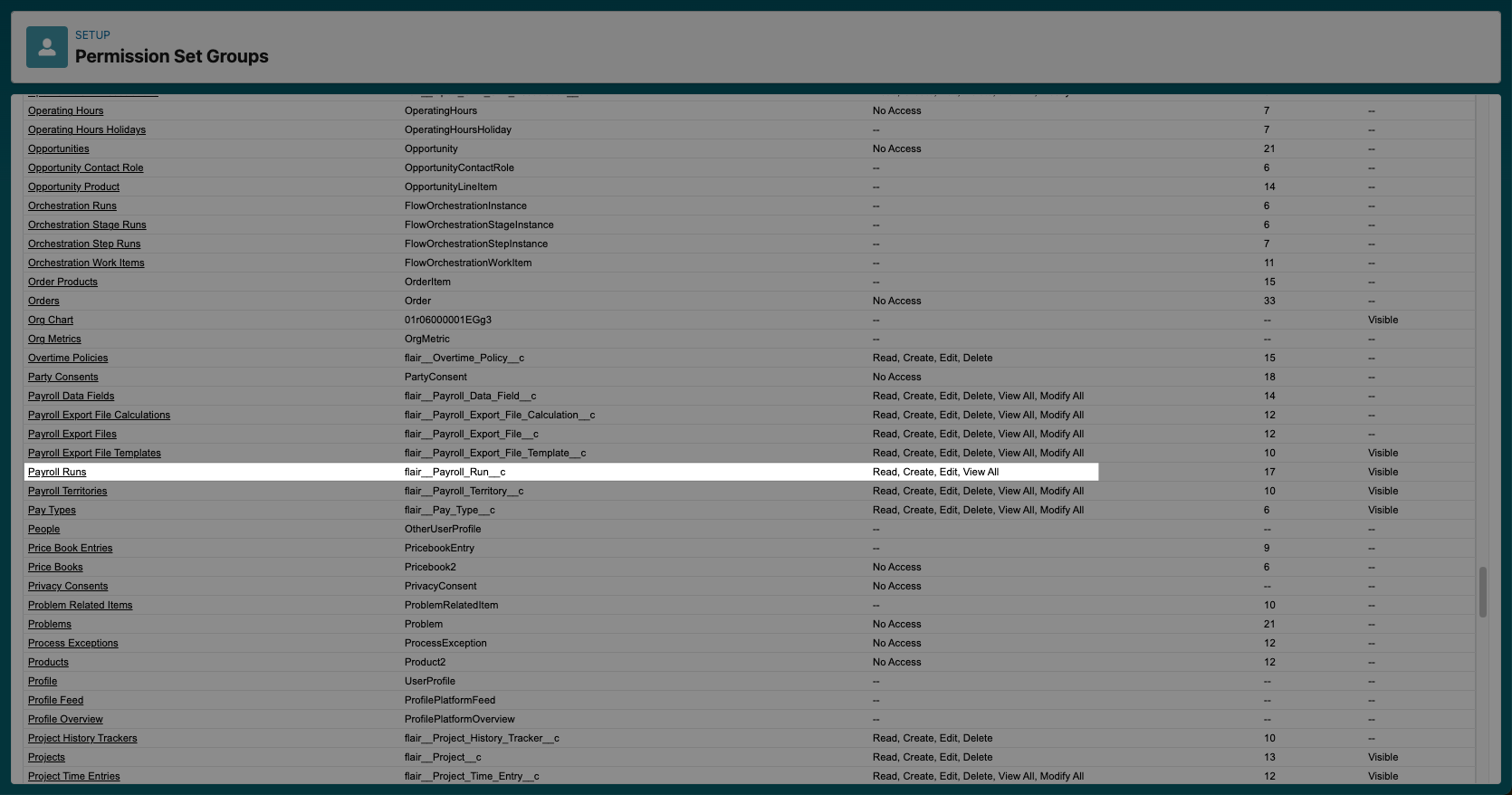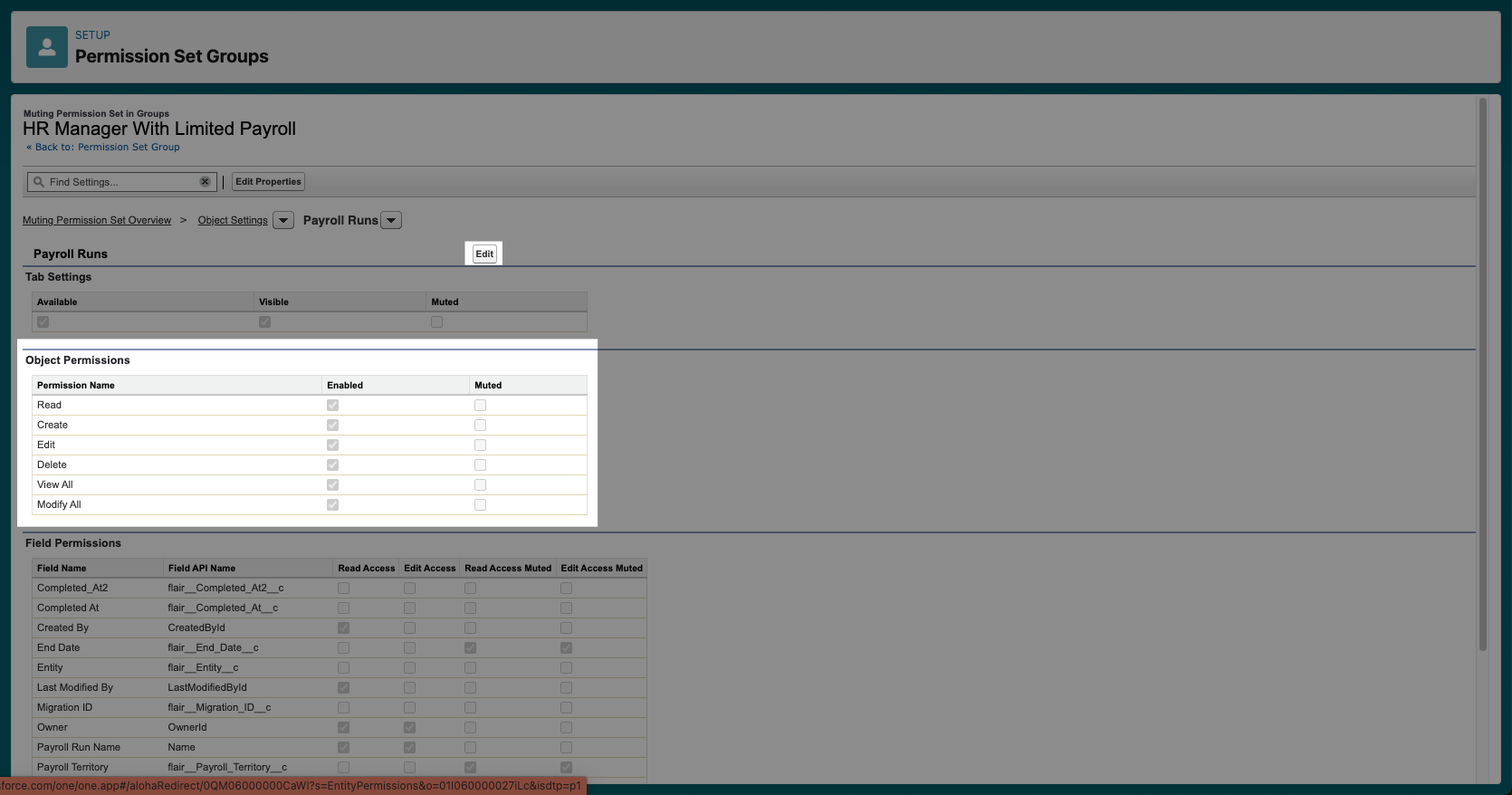 - You will now see an overview of Tab Settings, Object Permissions, and Field Permissions. In our example, you can see that the Flair Payroll Manager is granting full permissions to the Payroll Runs object, including Delete permission. To mute this permission, click Edit.